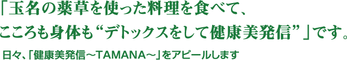 薬草料理と玉名温泉をメインに、玉名に来たお客様が健康になれる地域づくりを目指し、玉名地域の魅力を発信していきます。