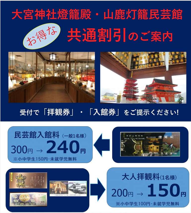 現在、「大宮神社燈籠殿」ご見学受付の際に、【山鹿灯籠民芸館入館券】【八千代座入館券】【八千代座・山鹿灯籠民芸館共通入館券】のいずれかをご提示いただくと、燈籠殿・拝観料がお安くなり、また、「山鹿灯籠民芸館」受付にて、【大宮神社「燈籠殿」拝観券】をご提示いただくと、山鹿灯籠民芸館・入館料がお安くなる共通割引を実施されておりますので、お得に見学することが出来ます。