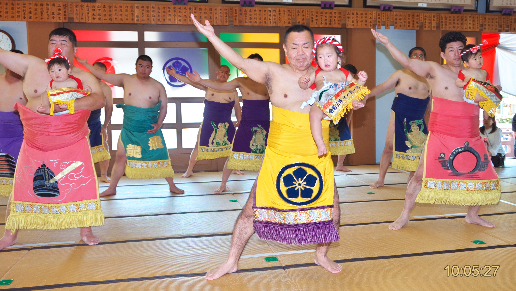 午前の部と午後の部の2回に分け、力士が赤ちゃんを抱き、身体健全、無病息災、知能啓発の土俵入りを行います。