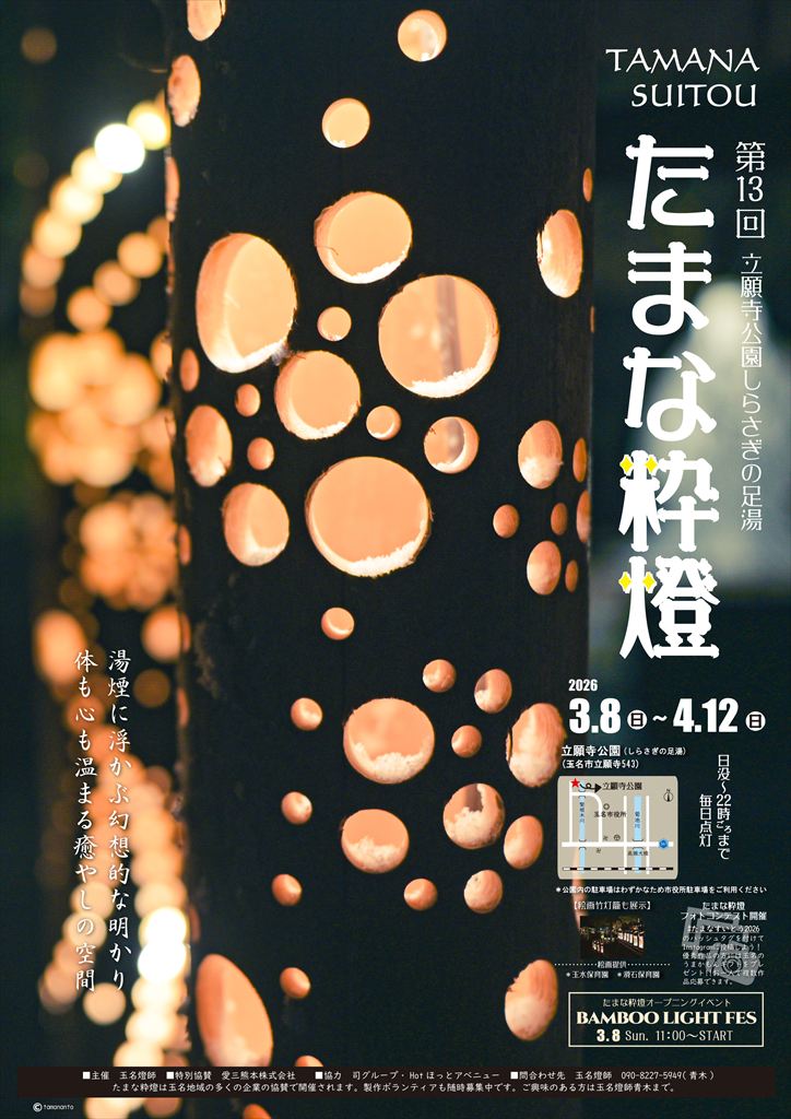 今年で13回目を迎えるたまな粋燈による竹あかり。立願寺公園しらさぎの足湯では、湯煙に浮かぶ幻想的な明かりを楽しめます。