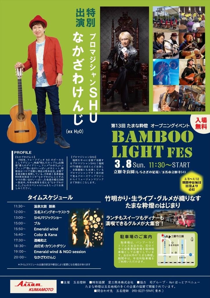 3月8日(日)は、たまな粋燈オープニングイベントとして、「BANBOO LIGHT FES」が行われます。メインゲストに「思い出がいっぱい」で知られるなかざわけんじさんをお迎えし、熊本や福岡で活躍されているミュージシャンによるライブ、また、太鼓演奏やプロマジシャンSHUさんによるマジックショーなど、イベント盛りだくさんです!