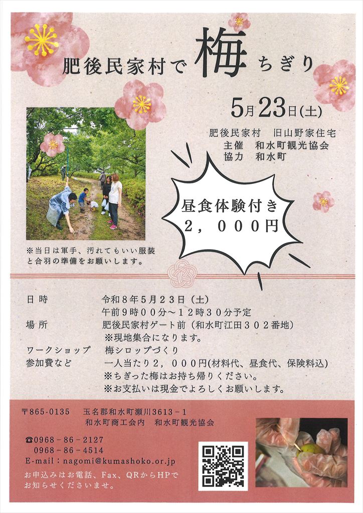 和水町江田の肥後民家村では、今年も梅ちぎり体験が開催され、現在、参加者を募集しています。